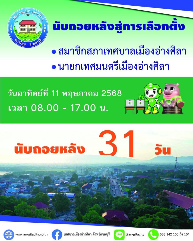 พร้อมใจไปใช้สิทธิเลือกตั้ง สมาชิกสภาเทศบาลเมืองอ่างศิลา และนายกเทศมนตรีเมืองอ่างศิลา ในวันอาทิตย์ที่ 11 พฤษภาคม 2568 ตั้งแต่เวลา 08.00 – 17.00 น. ณ หน่วยเลือกตั้งที่ท่านมีชื่อ