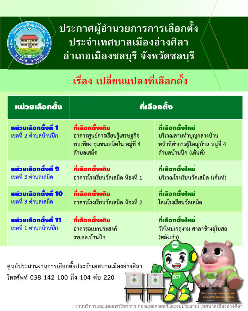 ประกาศผู้อำนวยการการเลือกตั้งประจำเทศบาลเมืองอ่างศิลา โดยให้เปลี่ยนแปลงที่เลือกตั้งของหน่วยเลือกตั้ง ดังนี้