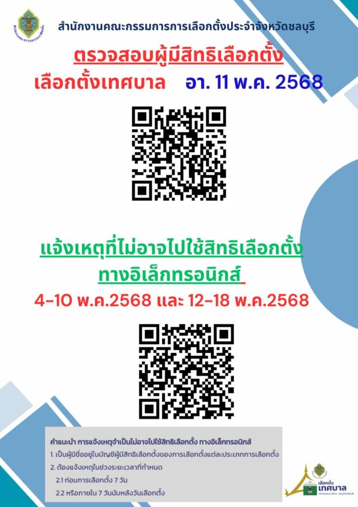 เลือกตั้ง สมาชิกสภาเทศบาลเมืองอ่างศิลา และนายกเทศมนตรีเมืองอ่างศิลา ในวันอาทิตย์ที่ 11 พฤษภาคม 2568 ตั้งแต่เวลา 08.00 – 17.00 น. ณ หน่วยเลือกตั้งที่ท่านมีชื่อ