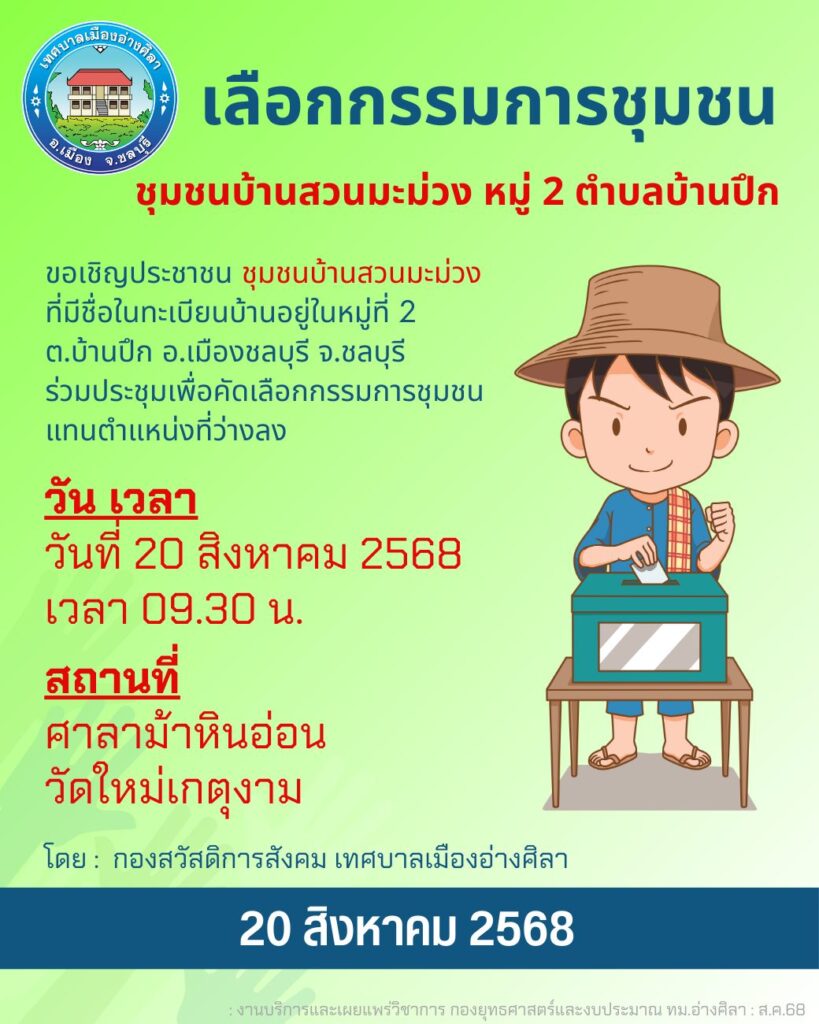 กองสวัสดิการสังคม เทศบาลเมืองอ่างศิลา ขอเชิญประชาชน ชุมชนบ้านสวนมะม่วง ที่มีชื่อในทะเบียนบ้าน อยู่ในหมู่ที่ 2 ตำบลบ้านปึก อำเภอเมืองชลบุรี จังหวัดชลบุรี เข้าร่วมประชุม เพื่อคัดเลือกกรรมการชุมชน แทนตำแหน่งที่ว่างลง โดยกำหนดประชุมคัดเลือกกรรมการชุมชน ชุมชนบ้านสวนมะม่วง แทนตำแหน่งที่ว่างลง ในวันที่ 20 สิงหาคม 2568 เวลา 09.30 น. ณ ศาลาม้าหินอ่อนวัดใหม่เกตุงาม ตำบลบ้านปึก อำเภอเมืองชลบุรี จังหวัดชลบุรี