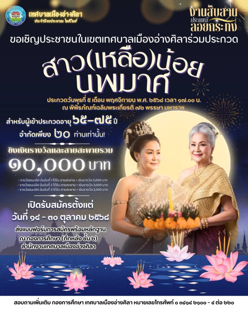เทศบาลเมืองอ่างศิลา ขอเชิญร่วมประกวด “สาว (เหลือ) น้อยนพมาศ” ในงานสืบสานประเพณีลอยกระทง ประกวดวันพุธที่ 5 เดือน พฤศจิกายน พ.ศ. 2568 เวลา 17.00 น. ณ พิพิธภัณฑ์เฉลิมพระเกียรติ 72 พรรษา มหาราช