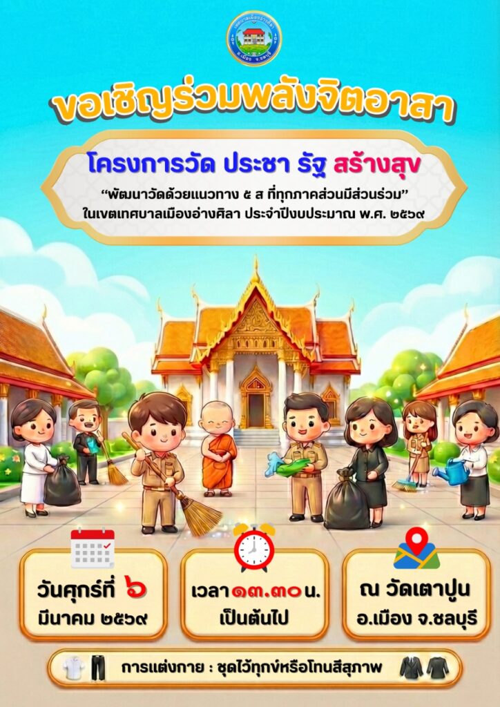 ขอเชิญประชาชนร่วมกิจกรรม (จิตอาสา) ทำความสะอาดบริเวณวัดเตาปูน โครงการวัด ประชา รัฐ สร้างสุข “พัฒนาวัดด้วยแนวทาง 5 ส ที่ทุกภาคส่วนมีส่วนร่วม